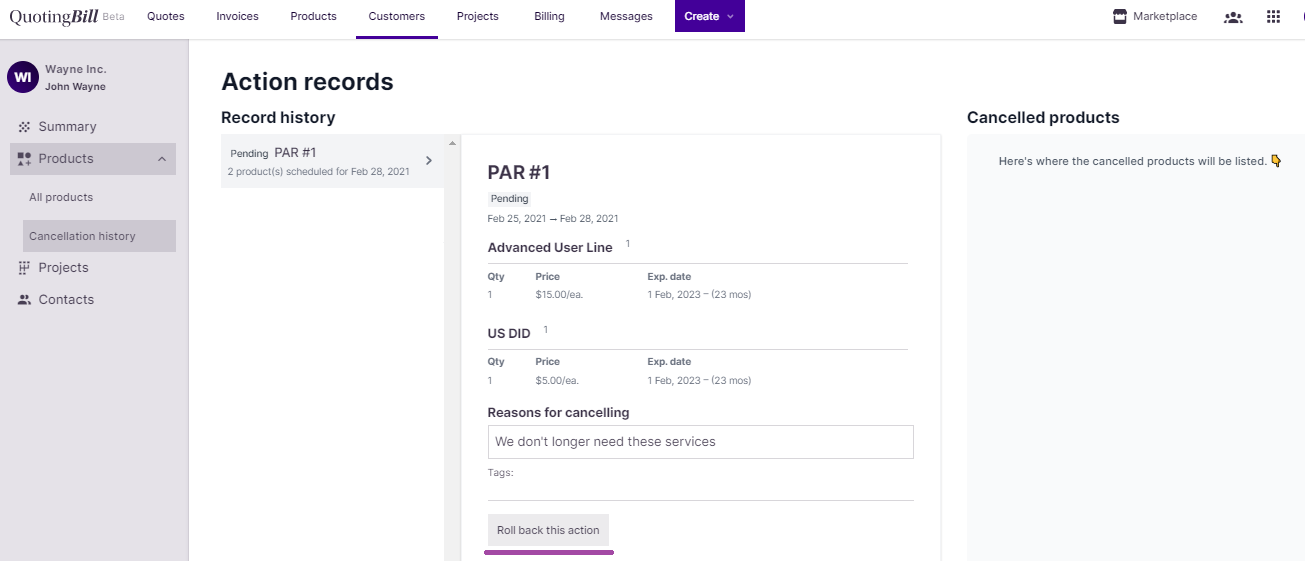 Finally, once the cancellation is executed, you will find it under cancelled products in the cancellation history.